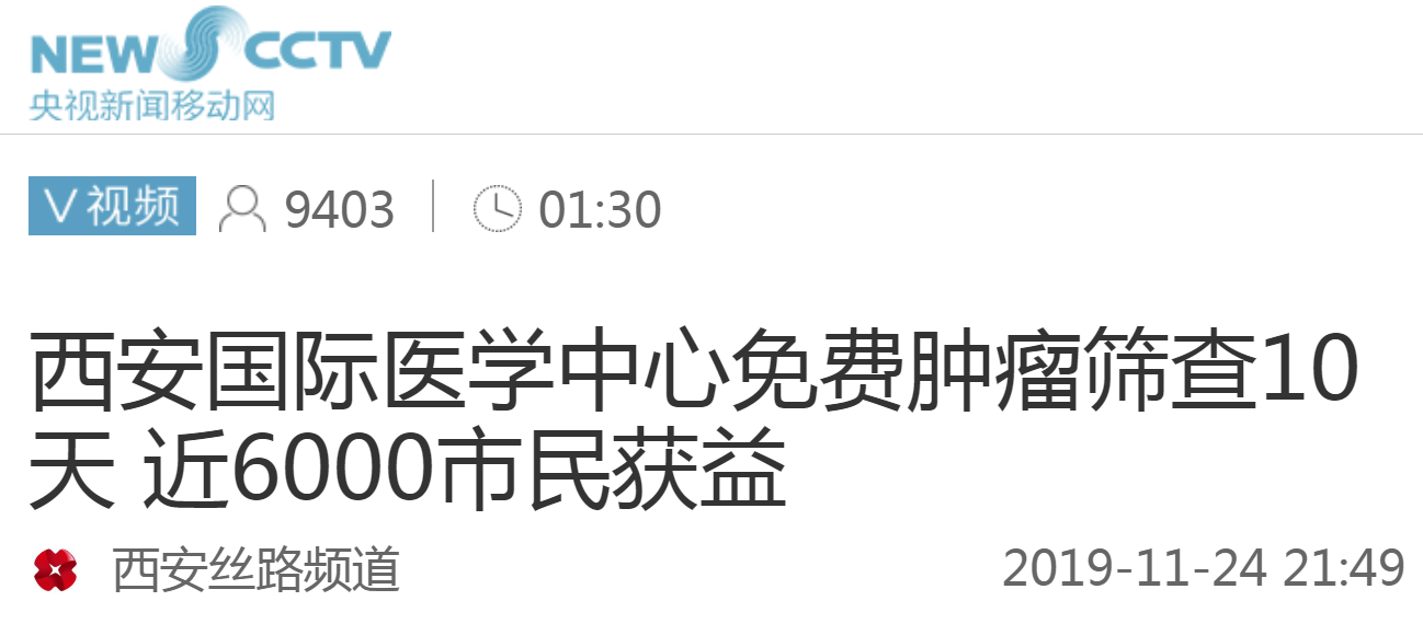 央視新聞移動網(wǎng)報道—西安國際醫(yī)學(xué)中心免費(fèi)腫瘤篩查10天 近6000市民獲益。點(diǎn)擊閱讀。