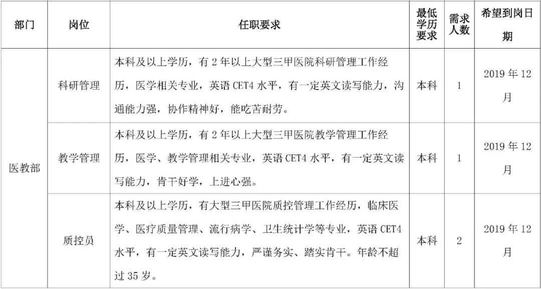 擁護(hù)黨的路線、方針、政策;遵守國家法律、法規(guī);熱愛本職工作,責(zé)任心強(qiáng),有良好的職業(yè)道德,認(rèn)同國際醫(yī)學(xué)價值理念,愿意投身醫(yī)療事業(yè);所學(xué)專業(yè)必須與應(yīng)聘崗位要求相符或必須具有相關(guān)從業(yè)經(jīng)歷。