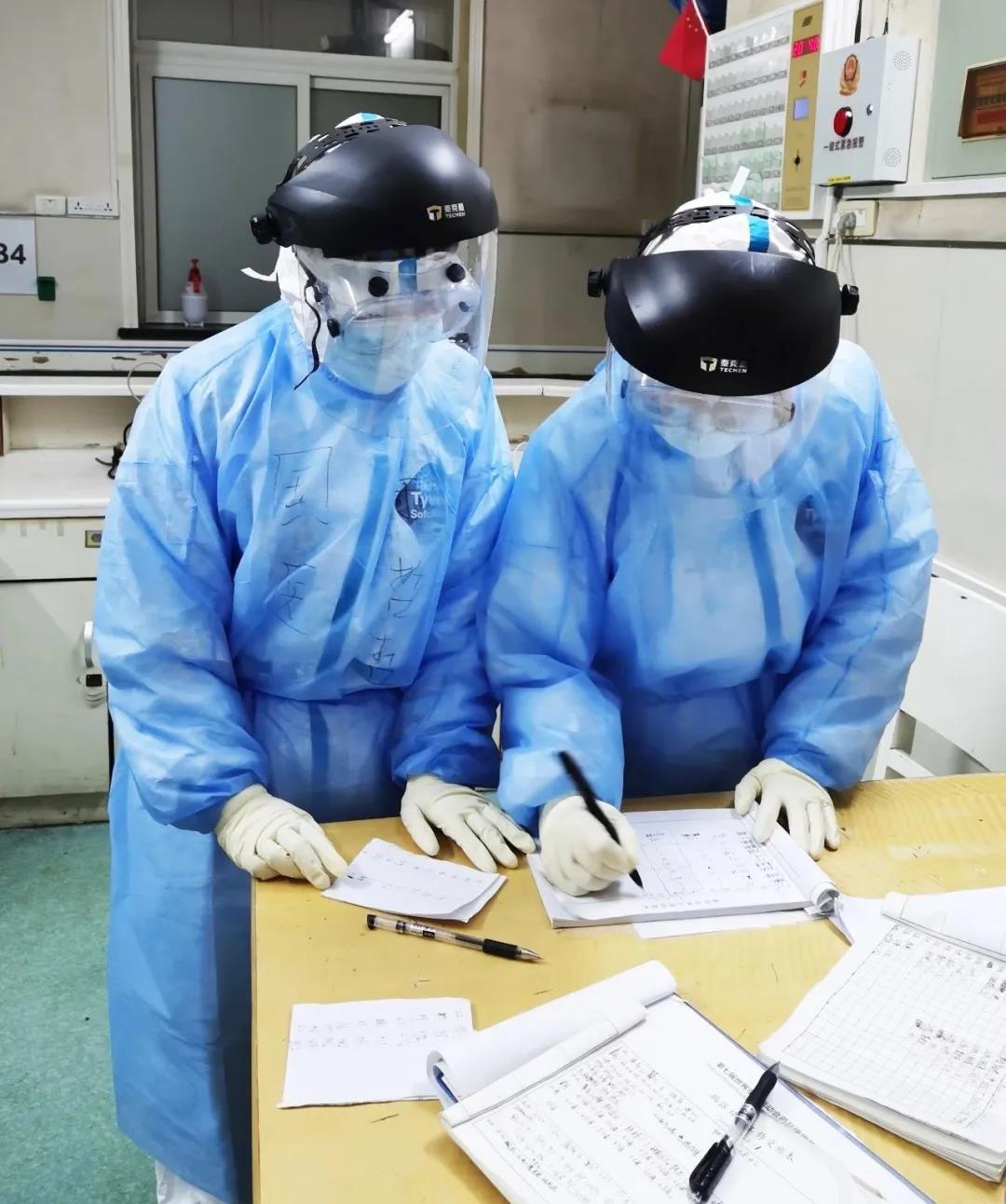 在抗“疫”工作中,她們一邊用精湛的護理操作技術為患者減輕病痛的折磨,一邊用溫暖貼心的話語增加患者戰(zhàn)勝疾病的信心。穿著厚重的防護服、隔離衣,戴著護目鏡、面屏、3層手套為患者穿刺留置針,取咽拭子標本,抽取血標本,氧氣吸入,口服藥發(fā)放,醫(yī)囑的處理,床單元的消毒……這就是她們繁忙的日常工作。