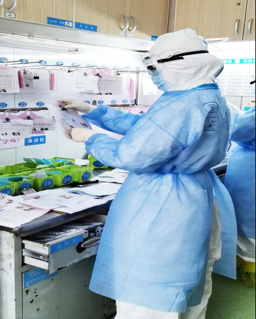一線臨床的治療和護(hù)理工作,是真正考驗(yàn)技術(shù)的環(huán)節(jié)。加藥配藥嚴(yán)格無菌操作、雙人核對(duì)。戴著多層防護(hù)手套工作,一雙“大手”小心翼翼拿取每一小支安瓿抽吸藥液時(shí)稍顯笨拙,但是護(hù)士說:“現(xiàn)在加藥的姿勢(shì)可能有點(diǎn)狼狽,但是我沒有浪費(fèi)一滴藥,這都是在科室練出來的基本功?!?/span>