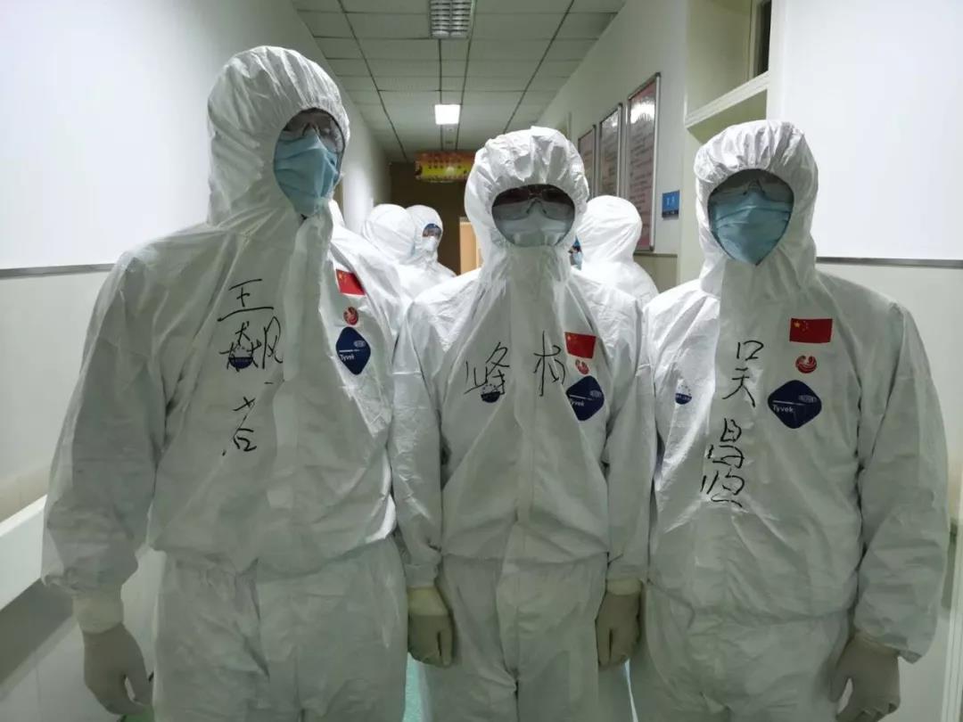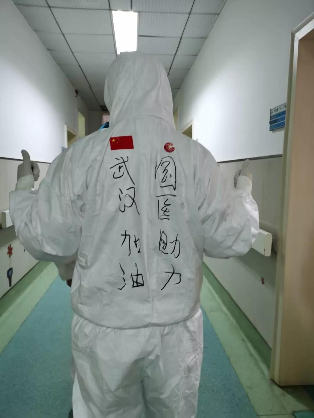 培訓(xùn)后的隊(duì)員開始穿戴防護(hù)服,由于身著防護(hù)服,看不清彼此的面容,醫(yī)護(hù)人員在防護(hù)服上背后寫上自己的姓名,一個個化身暖心“大白”,彼此加油打氣,“武漢加油、國醫(yī)加油!”一字一句鼓舞人心,充滿力量。面對疫情和種種未知的風(fēng)險(xiǎn),西安國際醫(yī)學(xué)中心醫(yī)院醫(yī)療隊(duì)隊(duì)員主動請纓,勇于上前,他們是最美逆行者!