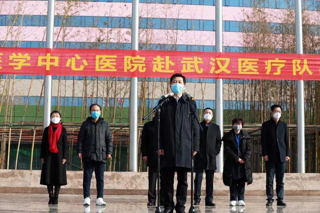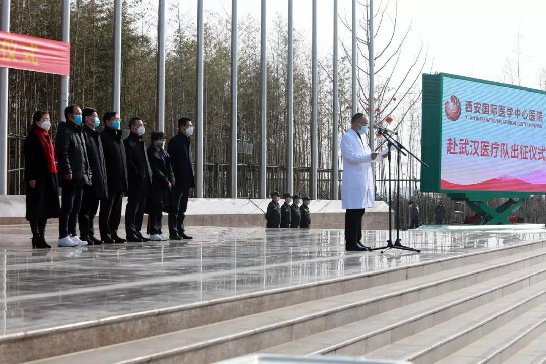 上午10時(shí)30分,出征儀式在西安國際醫(yī)學(xué)中心醫(yī)院萬人廣場(chǎng)舉行。尹強(qiáng)院長講話,并向醫(yī)療隊(duì)授旗。他說,平時(shí)我們是醫(yī)務(wù)人員,但在關(guān)鍵時(shí)刻,在疫情面前,我們就是白衣戰(zhàn)士。醫(yī)療隊(duì)隊(duì)長楊峰副院長表態(tài),當(dāng)人民安全在危難之際,我們責(zé)無旁貸。作為國際醫(yī)學(xué)人,我們將不辱使命,迎難而上,作出應(yīng)有貢獻(xiàn)。