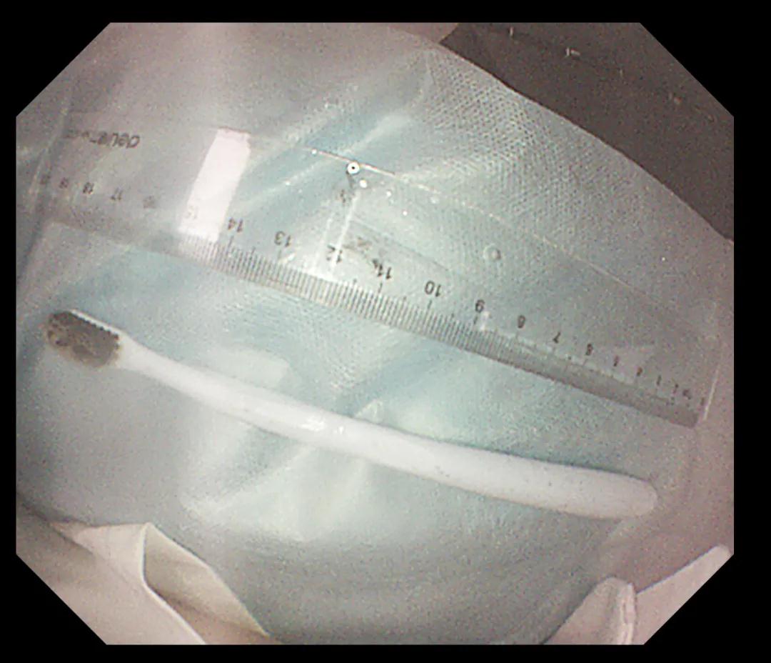 經(jīng)過反復(fù)努力嘗試,圈套器終于緊緊的套住異物,使牙刷長軸盡量與食道長軸平行,適當注氣擴張食道腔。經(jīng)過不懈努力,順利將其取出,取出牙刷經(jīng)測量長度約20cm,似乎這條細細的胃鏡就是一條連接希望的生命線。此時在場所有人懸著的那顆心也終于落下。術(shù)后小楊癥狀逐漸消失,生命指征平穩(wěn),情緒也平靜下來。