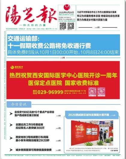 2020年9月25日,在西安國際醫(yī)學(xué)中心醫(yī)院一周歲生日之際,陜西日報、西安晚報、華商報、三秦都市報、陽光報分別刊文送上生日祝福。