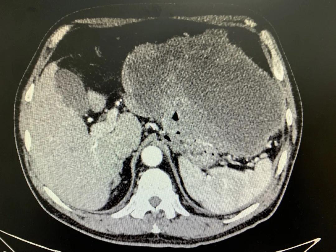 患者入院時血紅蛋白數(shù)值仍持續(xù)下降,出現(xiàn)失血性休克表現(xiàn),危及生命。消化外科二病區(qū)蔡磊主任接診后,組織科室迅速對患者進行了全面的檢查。CT提示腫瘤大小約19.3*10.3cm,腫瘤內(nèi)提示大量積血。結合相關檢查,考慮為罕見的巨大胃間質(zhì)瘤合并出血。