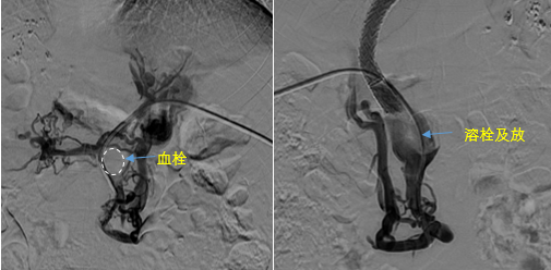 見(jiàn)此情形,韓國(guó)宏教授憑借豐富的臨床經(jīng)驗(yàn)很快調(diào)整了策略,在超聲診療中心的協(xié)助下進(jìn)行門靜脈右支穿刺,并進(jìn)行造影,看到目標(biāo)血管后,韓國(guó)宏教授用“明修棧道,暗渡陳倉(cāng)”的方法,讓來(lái)自脾臟和胃腸的血流終于暢通的回流到了肝靜脈。通過(guò)血流的沖刷以及抗凝溶栓藥物的作用,幾日后復(fù)查造影發(fā)現(xiàn)門靜脈血栓已逐漸變小,不會(huì)對(duì)回流到肝臟的血流產(chǎn)生大的阻礙作用,門靜脈的壓力顯著減小,患者再次出血的幾率也隨之降低。幾經(jīng)周折,這顆“定時(shí)炸彈”終于被拆除,李女士和她的家人多年來(lái)心里的石頭也終于落地。