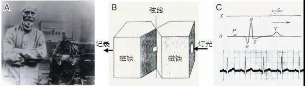 A:Einthoven;B:弦線(xiàn)式心電圖機(jī)模式圖;C:首例弦線(xiàn)式心電圖機(jī)記錄的心電圖