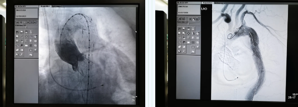 張金洲副院長關(guān)注著手術(shù)的每一個細(xì)節(jié),從建立軌道、跨瓣、釋放瓣膜、支架定位、造影和食道超聲確認(rèn),每一步都緊張而有序地進行著。為了最大程度保障病人安全,心臟外科程亮副主任也帶隊建立動靜脈入路,以備緊急體外循環(huán)。經(jīng)過團隊每一位成員的密切配合,在近四小時的緊張奮戰(zhàn)之后,“TAVR TEVAR”復(fù)合手術(shù)順利完成;經(jīng)過造影和食道超聲證實:人工主動脈瓣無返流無瓣周漏、冠脈顯影良好,主動脈覆膜支架無內(nèi)漏無移位。