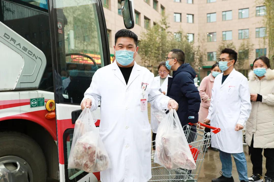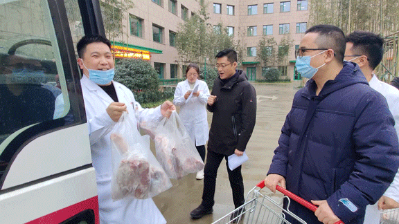 當(dāng)日上午,蒙古國捐贈(zèng)的486箱冷凍羊乘“接運(yùn)專車”到達(dá)陜西西安。按照國家統(tǒng)一部署,羊經(jīng)過嚴(yán)格檢驗(yàn)檢疫加工后轉(zhuǎn)運(yùn)陜西省,分配給前往湖北參與新冠肺炎疫情醫(yī)療救治工作的醫(yī)療隊(duì)員。我院收到100箱捐贈(zèng)羊。下午五點(diǎn),張良院長助理帶領(lǐng)綜合辦公室工作人員,將一袋袋羊肉發(fā)到醫(yī)療隊(duì)隊(duì)員們手中。