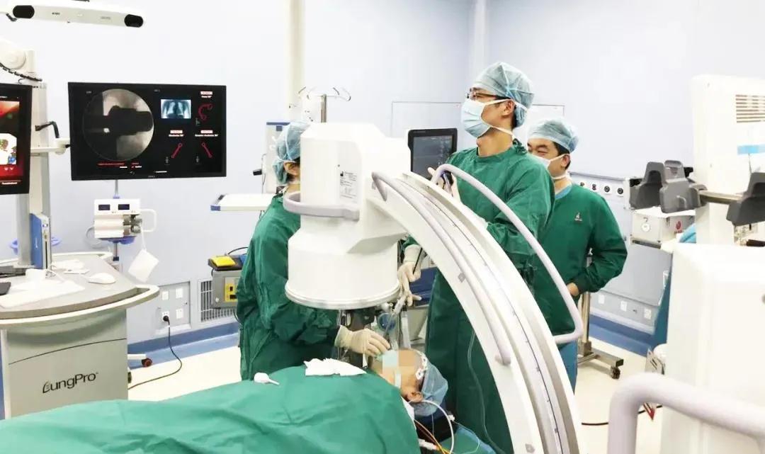 4月13日,在呼吸介入室,歐陽海峰為患者全麻下行鞘管引導(dǎo)的經(jīng)支氣管鏡冷凍肺活檢術(shù)(GS-TBLC)。術(shù)中,他將鞘管引導(dǎo)的環(huán)掃超聲技術(shù)與TBCB技術(shù)結(jié)合起來,同時預(yù)置止血球囊,極大降低了患者大出血的風(fēng)險。半個小時的手術(shù)非常順利。