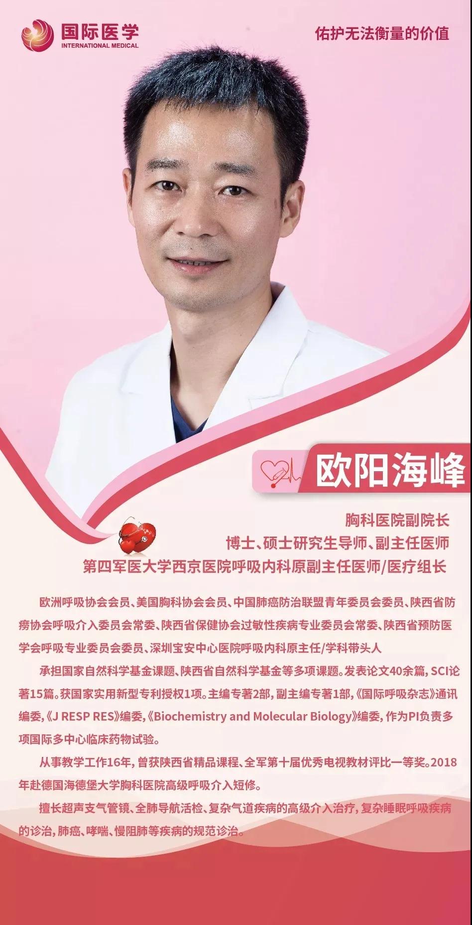 他叫歐陽海峰,中國肺癌防治聯(lián)盟青年委員會委員、陜西省醫(yī)師協(xié)會微無創(chuàng)醫(yī)學(xué)專業(yè)委員會常委、西安國際醫(yī)學(xué)中心醫(yī)院胸科醫(yī)院副院長。