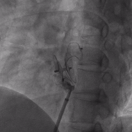 在獲得患者同意后,1月12日,尚福軍主任為患者進行了PFO封堵術。術中造影可見封堵器殘余漏,尚福軍主任用精湛的技藝,順利通過封堵器殘余漏裂縫,將右心導管從右房送入左房,且順利到達肺靜脈;遂行卵圓孔未閉封堵術后殘余漏再次封堵;且完美釋放PFO封堵器,可見兩封堵器呈“馬蹄蓮”狀,再次術中造影未見殘余漏。