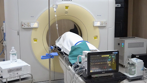 經(jīng)過放射治療中心陸軍主任的細致準備與精準定位,屈女士的射頻治療開始了?;颊卟扇∽髠?cè)臥位,麻醉醫(yī)生立即進行靜脈全麻。在CT引導(dǎo)下,醫(yī)生手中的“消融針”,按照既定路線“穿引”,快速、準確地插入右肺病灶部位,啟動射頻機器進行了精準的消融,右肺局部癌細胞一下子就被超高溫成功滅活了!經(jīng)CT掃查,無血氣胸;患者生命體征平穩(wěn)。2個小時后,屈女士就下地活動了。