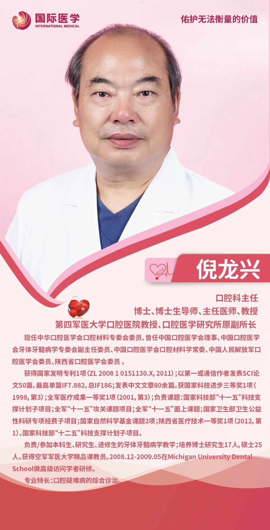 在動物世界中,牙齒是進食、戰(zhàn)斗、彰顯實力的工具,失去牙齒就意味著失去生命。人類進化到今天,牙齒除了咀嚼、輔助發(fā)音、面型美觀功能外,更是全身健康的晴雨表。心血管疾病、糖尿病、消化道疾病、阿爾茨海默病都與牙齒健康息息相關。據(jù)世界衛(wèi)生組織(WHO)報告:齲病及其繼發(fā)病是繼癌癥、心血管疾病之后危害人類健康的第三大非傳染性疾病。西安國際醫(yī)學中心醫(yī)院口腔科主任倪龍興從醫(yī)三十多年,孜孜不倦、兢兢業(yè)業(yè),用心守護著人們的牙齒健康。