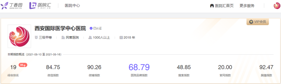 近日,丁香園醫(yī)院匯全國(guó)醫(yī)院品牌指數(shù)(5月10日—5月16日)周排行榜發(fā)布,西安國(guó)際醫(yī)學(xué)中心醫(yī)院進(jìn)入全國(guó)醫(yī)院品牌指數(shù)綜合排名前20強(qiáng),位列第19名。