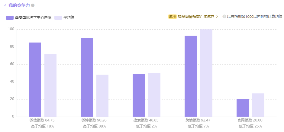 丁香園收錄了全國(guó)2000 醫(yī)院的品牌指數(shù),其中包括公立醫(yī)院與非公立醫(yī)院。榜單顯示:西安國(guó)際醫(yī)學(xué)中心醫(yī)院綜合排名第19名(較上周上升36個(gè)名次);醫(yī)院品牌指數(shù)68.79;微信指數(shù);84.75(高于平均值18%);微博指數(shù)90.26(高于平均值88%);搜索指數(shù)48.85(高于平均值2%);官網(wǎng)指數(shù)20(低于均值25%);輿情指數(shù)92.47(低于均值7%,正面輿情>負(fù)面輿情)。