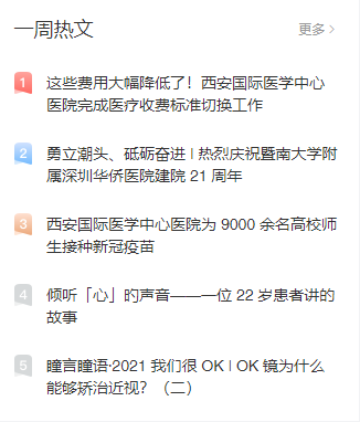 西安國(guó)際醫(yī)學(xué)中心醫(yī)院微信公眾號(hào)發(fā)布的《這些費(fèi)用大幅降低了!西安國(guó)際醫(yī)學(xué)中心醫(yī)院完成醫(yī)療收費(fèi)標(biāo)準(zhǔn)切換工作》《西安國(guó)際醫(yī)學(xué)中心醫(yī)院為9000余名高校師生接種新冠疫苗》《傾聽(tīng)心的聲音——一位22歲患者講的故事》3篇文章入選丁香園丁香號(hào)的一周熱文榜單前五名。