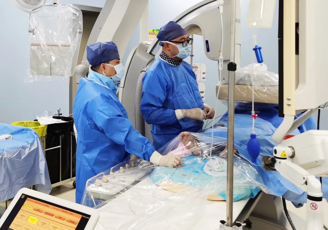 入手術(shù)室時(shí),患者神志迷糊,口唇干燥、重度貧血貌,心電監(jiān)護(hù)提示:心率140-160次/分,血壓70/43mmHg,這是失血性休克的表現(xiàn)!白葦快速建立靜脈通道緊急給予輸血,升壓,止血等液,立即給予肝動(dòng)脈造影,術(shù)中發(fā)現(xiàn)肝左葉疑似腫瘤病灶、病灶周圍血管分支有造影劑外溢,考慮血管破裂出血,迅速給予栓塞微球進(jìn)行肝動(dòng)脈栓塞。整個(gè)手術(shù)過(guò)程不足20分鐘,術(shù)后即刻患者心率降至100-110次/分、血壓升至90/60mmHg。