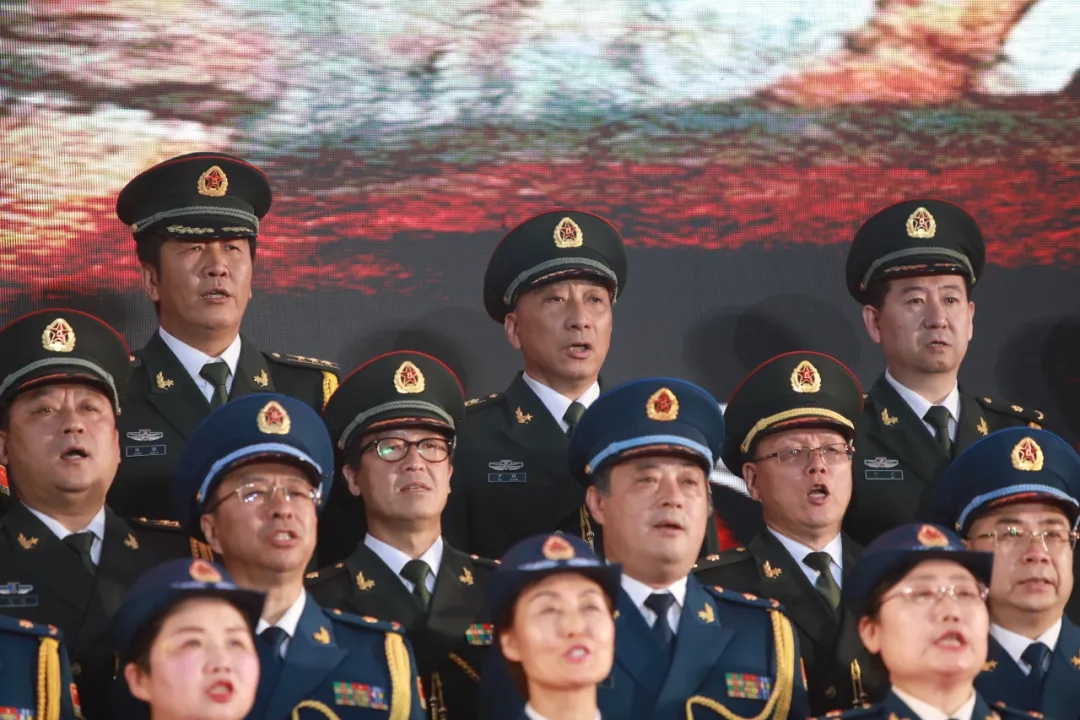 “一二一”,演出開始,由71名退役軍官組成的退役軍人合唱團(tuán),在尹強院長的帶領(lǐng)下,邁著整齊的步伐,喊著響亮的口號,雄赳赳,氣昂昂走上舞臺。