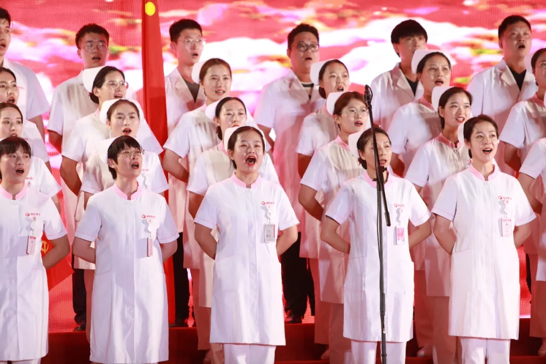 “夜半三更喲盼天明,寒冬臘月喲盼春風(fēng)……”合唱團(tuán)用歌聲抒發(fā)對偉大祖國的深深至愛,傾訴對醫(yī)學(xué)事業(yè)的拳拳之情。在領(lǐng)唱的帶領(lǐng)下,大家分男女聲部進(jìn)行輪唱,群情激昂,歌聲嘹亮。在全場的掌聲中,大家揮舞起手中的黨旗,抒發(fā)對祖國的熱愛。