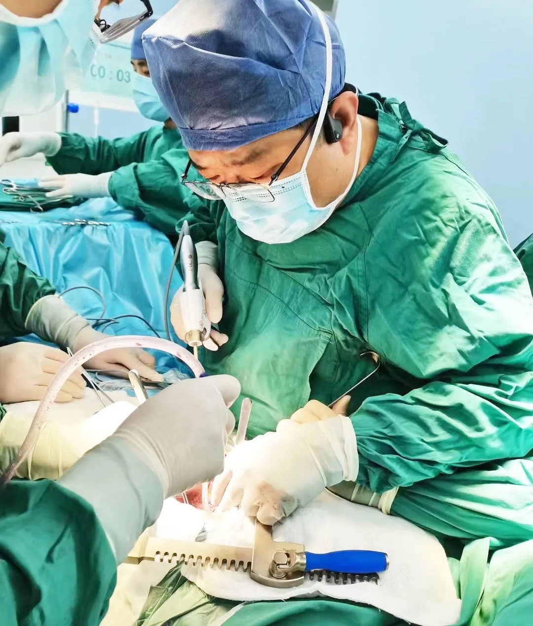 麻醉手術(shù)中心副主任丁倩為減輕患者術(shù)后不適,實施單腔聯(lián)合支氣管封堵插管,同時進行了肋間神經(jīng)阻滯麻醉。術(shù)中發(fā)現(xiàn)患者膈疝巨大,食管和疝囊分界不清,部分胃組織和結(jié)腸疝已進入胸腔。李文海憑借豐富的臨床經(jīng)驗,仔細辨別解剖變異,有序完成分離、縫合、修補等一系列操作,胸外科穆強副主任醫(yī)師、劉歡住院醫(yī)師、麻醉手術(shù)中心團隊通力配合,手術(shù)最終順利完成,患者安全返回胸外科監(jiān)護室病房。目前患者術(shù)后恢復(fù)良好,于近日準(zhǔn)備出院。