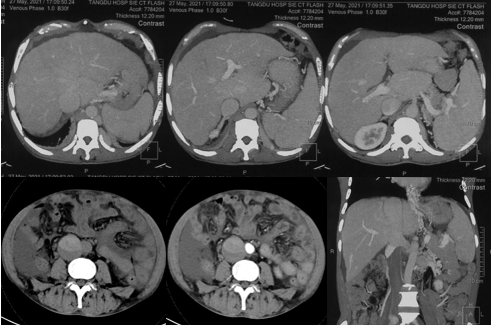 6月20日,患者及家屬懷揣著忐忑的心情來到西安國(guó)際醫(yī)學(xué)中心醫(yī)院找到韓國(guó)宏教授,韓教授詢問病情后閱患者外院CT片,明確診斷布加綜合征,同時(shí)發(fā)現(xiàn)了一個(gè)新的問題,在詢問病史時(shí)了解到患者近一周雙下肢乏力伴腫脹明顯加重,遂立即安排了急診CT,證實(shí)下腔靜脈內(nèi)急性血栓形成!