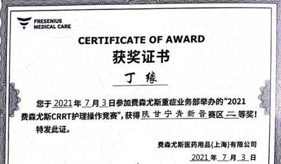 2021年5月,陜西省保健學(xué)會重癥醫(yī)學(xué)專業(yè)委員會舉辦了第三屆《“夯基礎(chǔ)?重質(zhì)量-重癥技能”血液凈化護(hù)理技能競賽》。丁緣經(jīng)過激烈角逐,從陜西省21家醫(yī)院的24名選手中脫穎而出,榮獲三等獎,拿到了全國聯(lián)賽的入場券。