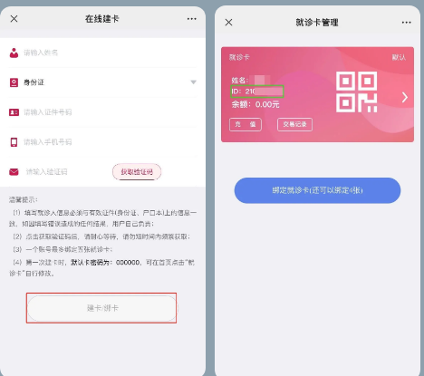 (1)沒有就診卡的人員,請輸入個人信息完成就診卡綁定。綁卡后,獲得個人ID號。(如圖所示)