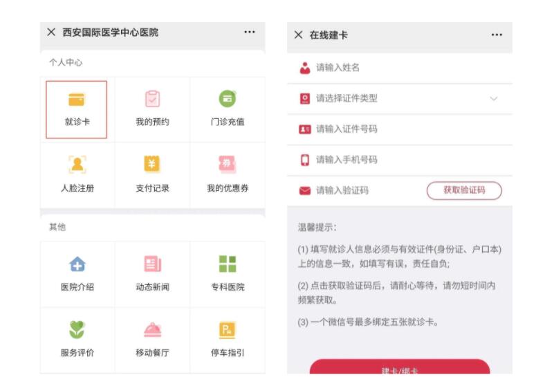 (2)沒有電子就診卡的人員,需輸入個(gè)人信息進(jìn)行在線建卡,建卡后返回診療服務(wù)頁(yè)面點(diǎn)擊【核酸檢測(cè)】,進(jìn)行核酸檢測(cè)預(yù)約并線上支付費(fèi)用。