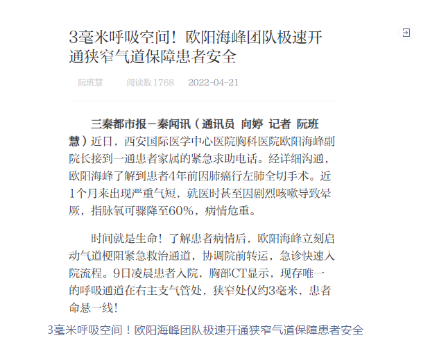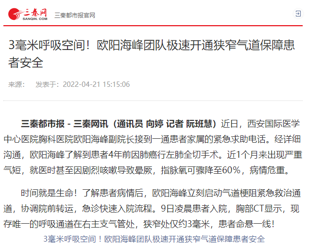 三秦都市報:3毫米呼吸空間!歐陽海峰團(tuán)隊極速開通狹窄氣道保障患者安全