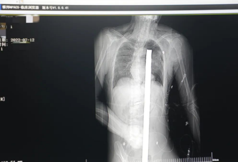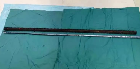情況緊急!術(shù)中探查后發(fā)現(xiàn),長120cm直徑3cm的螺紋鋼經(jīng)患者右側(cè)會陰部穿入,傷及直腸,途徑膀胱后方,左側(cè)髂總動靜脈之間傷及左腎后,經(jīng)胰腺后方在肝脾之間穿破膈肌,在下肺靜脈前方穿入左肺穿破氣管及左右主支氣管膜部,止于主動脈弓下水平,穿入體內(nèi)的部分達到75cm。