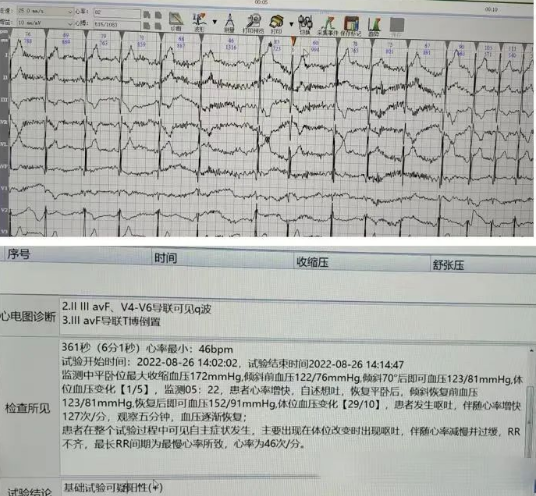 檢查前,心電檢查中心醫(yī)生仔細詢問患者病史,并簽署知情同意書后,進行正式檢查。打開錄播系統(tǒng)及傾斜試驗系統(tǒng),心電檢查中心張錄興主任帶領兩位醫(yī)生進行看護,傾斜前及傾斜后密切觀察患者的心率、血壓和自身狀態(tài)。當傾斜70?后4分鐘患者心率及血壓開始變化,自述頭暈想吐。即可恢復平臥位后測量血壓,患者出現(xiàn)體位變化后發(fā)生嘔吐,伴隨心率由快變慢,并出現(xiàn)明顯竇性心動過緩伴不齊,最慢可達46次/分,嘔吐過后心率逐漸上升90次/分,患者自述暈厥癥狀消失,血壓心率平穩(wěn)后,試驗結束,診斷暈厥試驗可疑陽性。