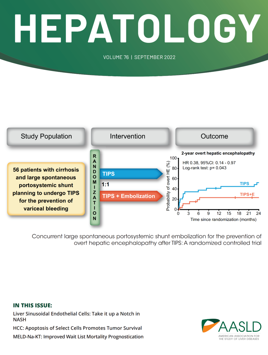 新近,西安國際醫(yī)學(xué)中心醫(yī)院消化病醫(yī)院韓國宏教授團(tuán)隊的一項隨機(jī)對照試驗“經(jīng)頸靜脈肝內(nèi)門體靜脈分流術(shù)(TIPS)聯(lián)合自發(fā)性門體分流封堵預(yù)防術(shù)后顯性肝性腦病”的論著被最新一期的Hepatology雜志(IF=17.29,JCR:Q1)遴選為9月份封面文章(圖1)。該研究顯示TIPS聯(lián)合粗大分流道封堵能夠有效降低TIPS術(shù)后顯性肝性腦病的發(fā)生率,且不增加門靜脈高壓、分流道功能障礙和其他不良事件的并發(fā)癥風(fēng)險[1]。