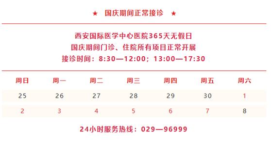 七天小長(zhǎng)假將至,節(jié)假日看病難一直是老百姓最為頭疼的問(wèn)題之一。為了更好地為患者提供優(yōu)質(zhì)的醫(yī)療服務(wù),西安國(guó)際醫(yī)學(xué)中心醫(yī)院國(guó)慶期間門(mén)診不停診、手術(shù)不停臺(tái)、住院不影響,為患者健康保駕護(hù)航。