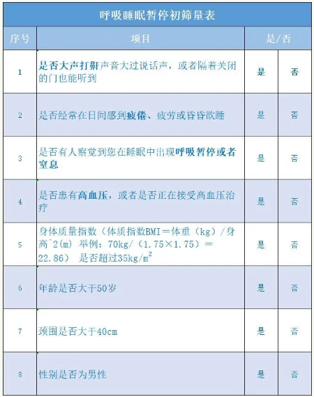 家人觀察打鼾者,呼嚕聲沒節(jié)奏,不規(guī)律,這種呼嚕不是好呼嚕。我們也可以通過一些簡單的量表自測,看是否有這個疾病的傾向。