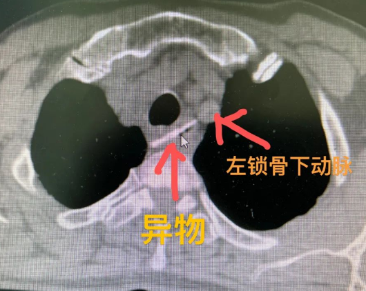 3厘米“V”形雞骨頭卡在食道,咽不下去,吐不出來,更為嚴(yán)重的是,這根硬骨頭距離左鎖骨下動(dòng)脈僅2㎜......