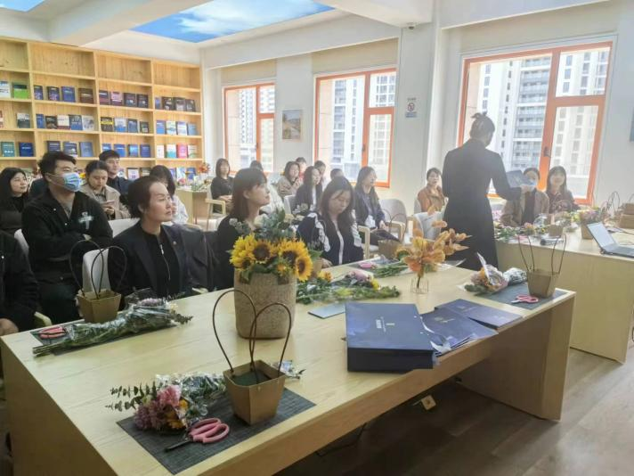 活動特邀了專業(yè)的花藝老師,現(xiàn)場為大家進行講解和指導?;ㄋ嚴蠋熢敿氈v解了各種花卉所蘊含的花語及插花技巧,大家發(fā)揮想象力,用自己靈巧的雙手,將經(jīng)過修剪的向日葵、非洲菊、康乃馨等多種花材,根據(jù)不同的色彩、形狀有層次地搭配在一起,在馥郁花香中感悟取舍之道、領會古雅之美。