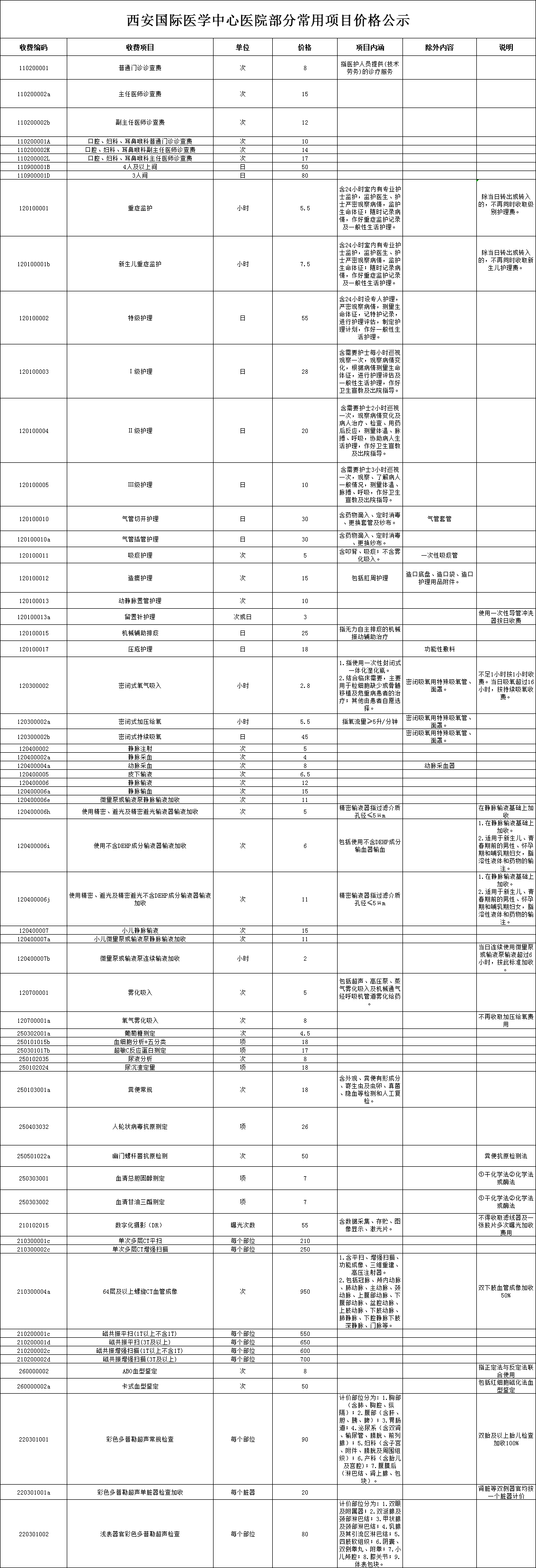 西安國際醫(yī)學(xué)中心醫(yī)院部分常用項目價格公示