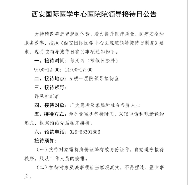 西安國際醫(yī)學(xué)中心醫(yī)院院領(lǐng)導(dǎo)接待日公告
