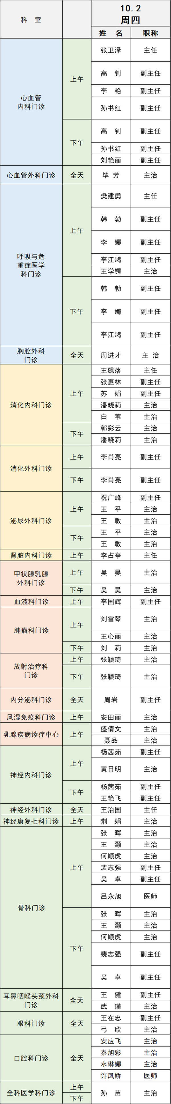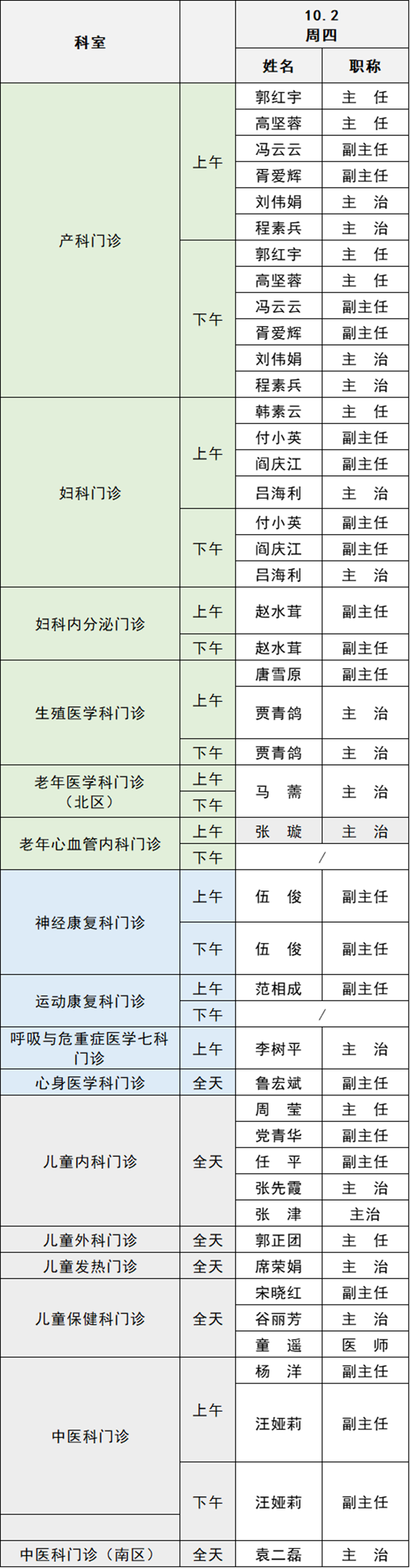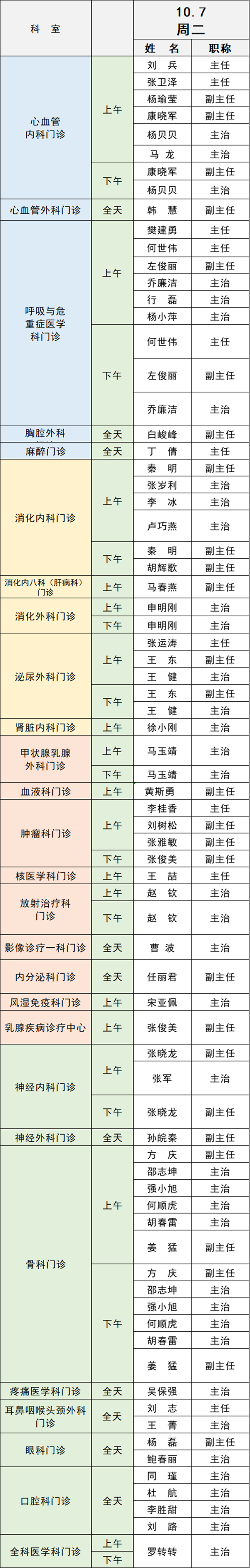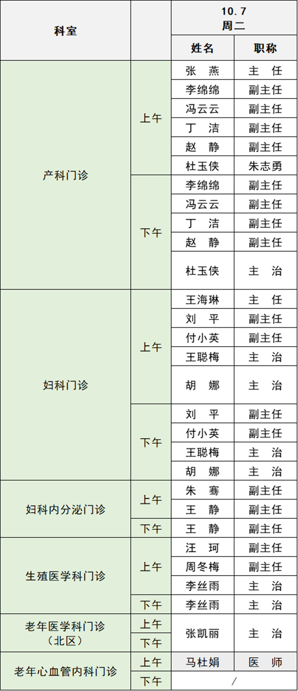 備注:實際出診情況以醫(yī)院掛號平臺實時信息為準(zhǔn)。“職稱”欄里主任=主任醫(yī)師副主任=副主任醫(yī)師主治=主治醫(yī)師